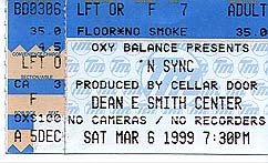 Well here's the story again.....I(Angela) left Atlanta around 10:30 to head to Chapel Hill to see the boys again..(I just went to Jacksonville a couple days earlier! I got there around 5:30 pm right when they were having sound check(it was going on when I picked up my ticket).So I went and got dressed and then waited to get in when I met two of the sweetest girls Kelly and Lindsay. These girls are so sweet!(that's how I got 6th row!)... Anyway..I saw Steve(I always seem to run into him...)...and he said that I'm always there.. which is true! I gave Lance this sweet Beanie Babie puppy! I had to use Steve's hat cause security was so tight! I liked that okay! Well the show started and I saw Tatyana and B*Witched again.. which was cool! The show started awesome as usual... and Joey and JC knew that I was there! But the show ended and JC lost his golf hat and Joey flew right over me*what a heavenly sight!* Well I was pretty tired after the show...and hanging with Kel-Kel and Linds. So I crashed for the night and the next morning I got up and played e-mail tag back to the Atl! If you want to see the pictures go here.. |