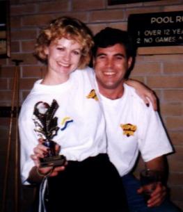 Sharyn and Peter. Sharyn is holding a trophy that she presented to all the workers from herself in appreciation for their efforts in making the day possible .