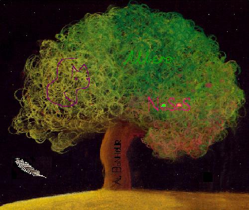 Dies links ist ein Foto von meinem Lieblingsbaum. Er heisst Albero (ital.=Baum) und zeigt Dir auf Wunsch verschiedene Dinge, die es in meinem Planetenland zu entdecken gilt. Du hast nun wieder einmal die Wahl: