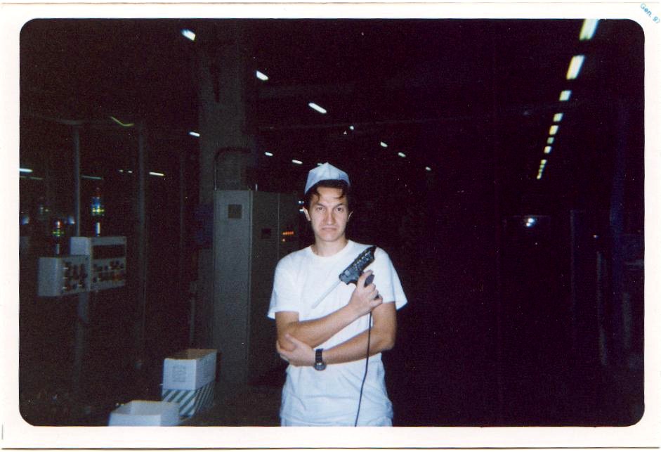 Io, in posa da 007 (almeno ci provo...), con la pistola saldapacchi, durante un turno di notte in Barilla. |