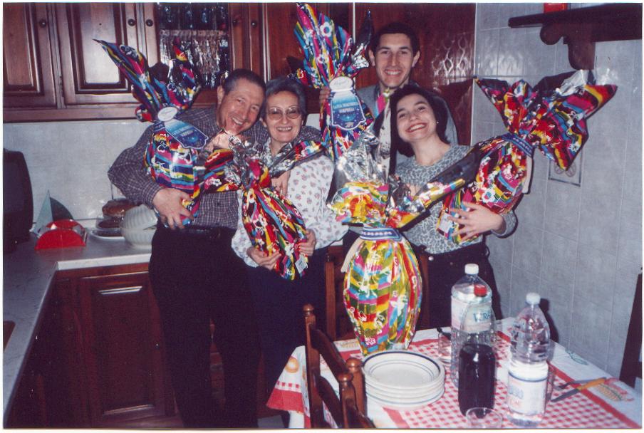 I miei genitori, Vittorio e Loredana, mio fratello Alessio e mia sorella Ilaria, sommersi dalle uova pasquali. |