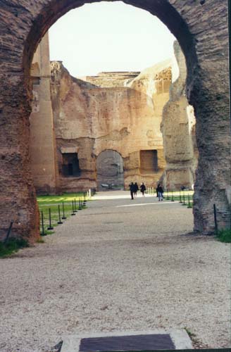 Baths of Caracalla, Rome. Competed by the Emperor Caracalla in AD 217, it was a grand recreation area for Romans until the 6th century when the plumbing was cut by invading Goths. The bath could accommodate over 1500 people at once. A Roman bath took a while, beginning with a hot bath, then a trip to the calidarium, a kind of sauna/steam room. Next you moved to the tepidarium, a warm room, and then the frigidarium, a cool room (pictured). Finally, the bather would jump into the natatio, a swimming pool (to the left of the picture). This picture was taken from one of the two gymnasiums, the other is at the far end of the frigidarium through the arched doorway. The baths also included a library, conference rooms, and a 3000 seat stadium. |