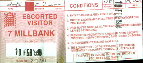 Shown Here, the pass into 7 Millbank where several MPs have offices that was given out when I lobbied Chez Gillan, MP for the constituency of Amersham and Chesham. Surprisingly, Chez isn't really that great, only ever managing to become a very junior minister under John Major, despite having one of the safest Tory seats in the country. Makes you wonder who she slept with...