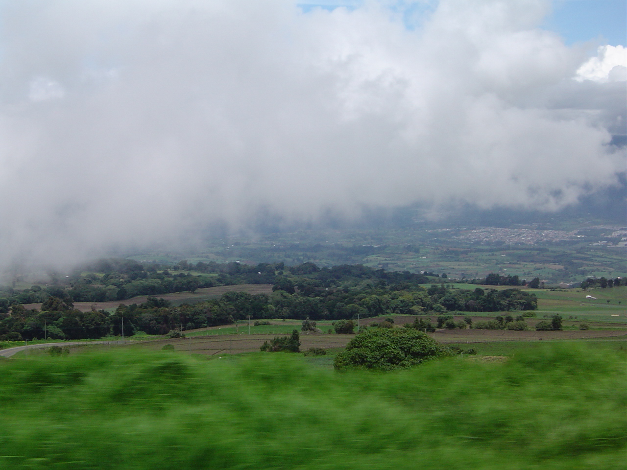 | We started by going out to Volcan Irazú. It's the largest and highest active volcano in Costa Rica and on a clear day (which it was not) you can see both the Carribean and Pacific coasts from the summit. That unavailable, it was still neat to be above the clouds. In the volcano's crater is a lagoon of greenish water, made so by the volcano's chemical makeup. | |