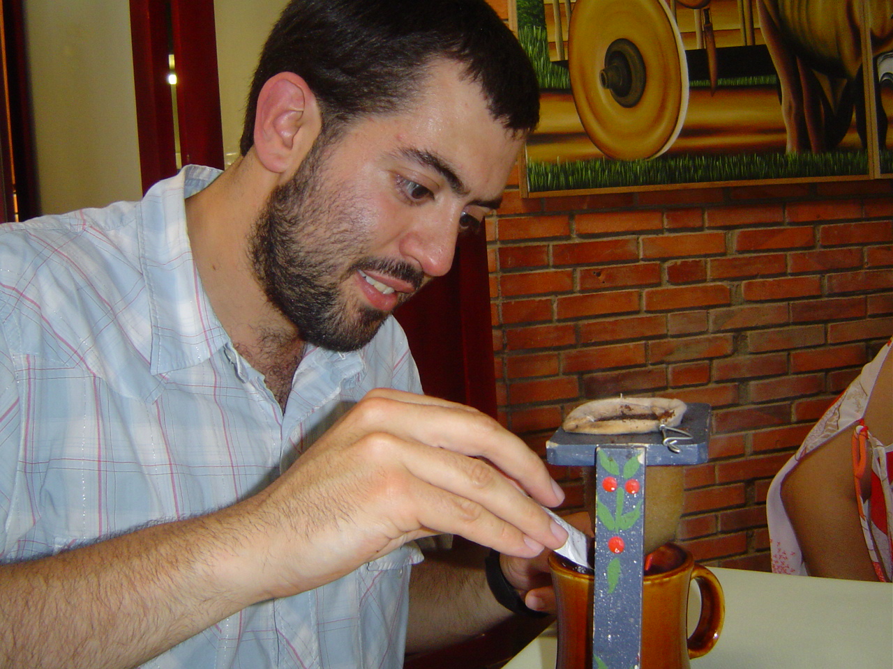 | We...ate in...Paraíso, at La Casona de Cafetal, a restaurant in the former house of the largest coffee plantation in Costa Rica. The food was phenomenal and buffet-style (and included with the tour!). An amazing assortment of excellent dishes, four kinds of flan (plain, coco, frutas, y café), and probably the best coffee I've had in my life to date. and it was served old-school, through a cheesecloth strainer. We sat with a Mexican couple and mom conversed with them the whole meal, which was great because it let me practice listening to Spanish. I followed the basics of most of the conversation and even answered a few questions. I think this English was as good as my Spanish; she seemed to speak no English at all. |