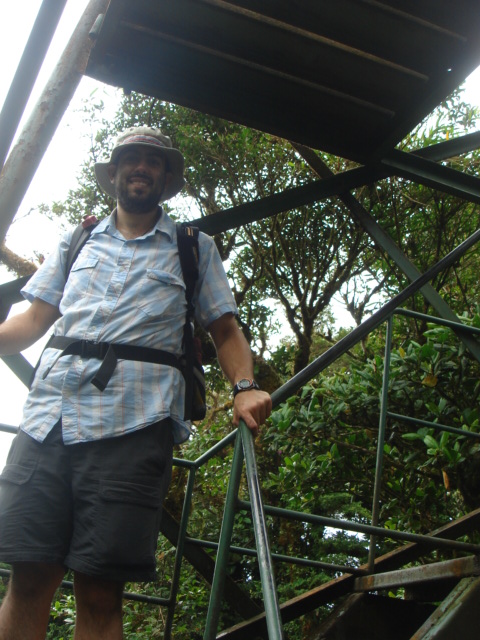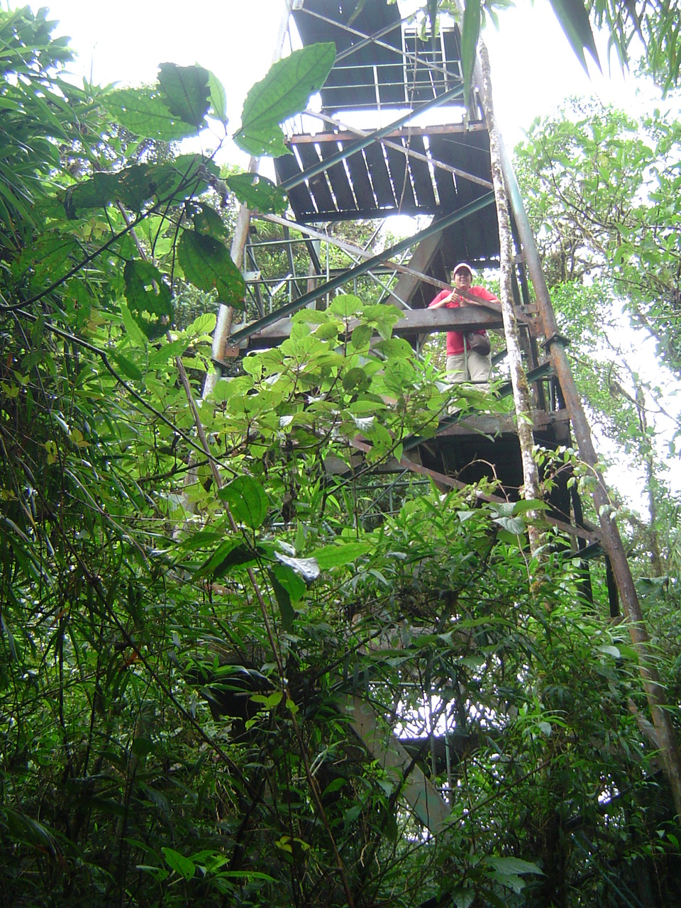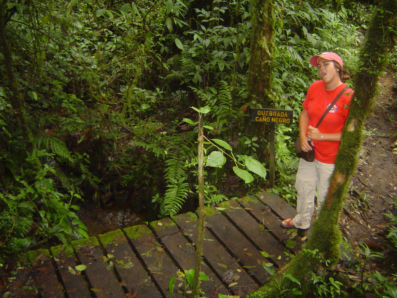 | We took a route (Caño Negro) that was 4.5 km and was supposed to take 3 ½ hours, but we did it in 2 1/3, with stops on the first quarter leg. There was a crickety old observation tower that I nearly surmounted (I made it halfway up the ladder leading from the penultimate to the last levels). The trail wound up and down, up and down, crossing four streams (one the Caño Negro -- all a little weaker than I'd hoped they'd be, pero bonito nonetheless). | |