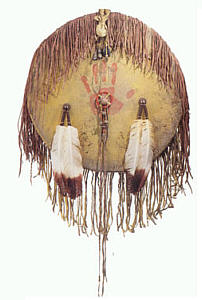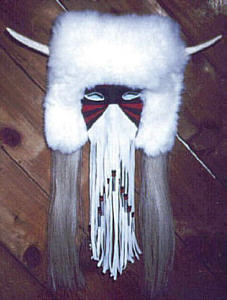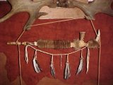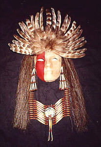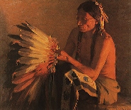 Local birds such as yellow-headed blackbirds, turkeys, ducks, flickers, woodpeckers, road runners, and scissortails were the sources of a bonnet's plumage before the introduction of colorful modern dyes. Each part of the preparation of a single feather might have significance. The killing of any enemy was indicated in one tribe by horsehair tips. Among the Crees, it was shown the wearer had wrestled and overcome an enemy by the removal of web from most of the quill. The signature of the bonnet maker is indicated by the major plume in the back of the bonnet which marked the sign of individiual achievement. Distinguished warriors who performed many exploits were so honored by attaching strips of rabbit fur or ermine with pieces of cloth hanging down.