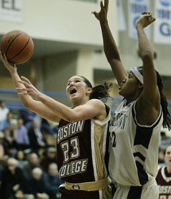 Boston College's Amber Jacobs (23) puts up a shot as Georgetown's Rebekkah Brunson (32) defends during the first half Wednesday, Feb. 11, 2004, in Washington.