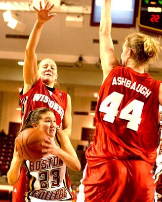 Boston College guard Amber Jacobs (23) squeezes between Wisconsin guard Erin Olson, rear, and forward Emily Ashbaugh (44) for a score during the first half in Boston, Tuesday, Dec. 30, 2003.(AP Photo/Robert E. Klein)