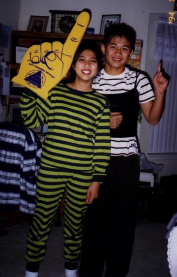 uhh..this is me and thai again..i tried to tell u we're strange.. i'm wearing my famous beetlejuice/drop dead fred/escape convict/blues clues/bumble bee pjs and thai's wearing my tank top!