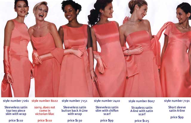 1-29-01 My dress came in last April, as promised, and it was a bit tight! I was so worried! I just had my first fitting last week, and it fits perfectly now! The only alteration that's necessary is the hem needs to be shortened. I went with Sabrina and her mom (mom).. I found a wonderful veil there, and mom surprised me by buying it for me while I was changing back into my regular clothes! THANKS MOM! Okay, well, when I decided I was finally ready to start seriously looking at bridesmaids dresses.. I was *unpleasantly* surprised that the ones I had originally wanted had been discontinued. So off we set to find new dresses! I decided to let the girls chose from the dresses below...