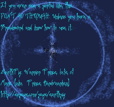 Welcome traveler. Have you too fallen through the portal? Well never mind. My name is Earthpig. Does it seem such a strange name to you? Earth is your homeworld after all, and in the most populous country on your world, the pig is considered great good luck. Weapons from your world have always brought me luck. I have fought beside your kind many times in the last hundreds of years. I left the palace of my mother the queen, Zxcvb of Mars. That was 600 years ago. I have worn Earth armor, and carried a blade from Earth all that time. That time on earth ended just a few days ago reckoned by this worlds sun. I stepped through a portal, and found myself here, with no obvious route back. Walk with me a while and I share my thought with you as we wend to yon tavern whose lights you can discern in the far distance.
