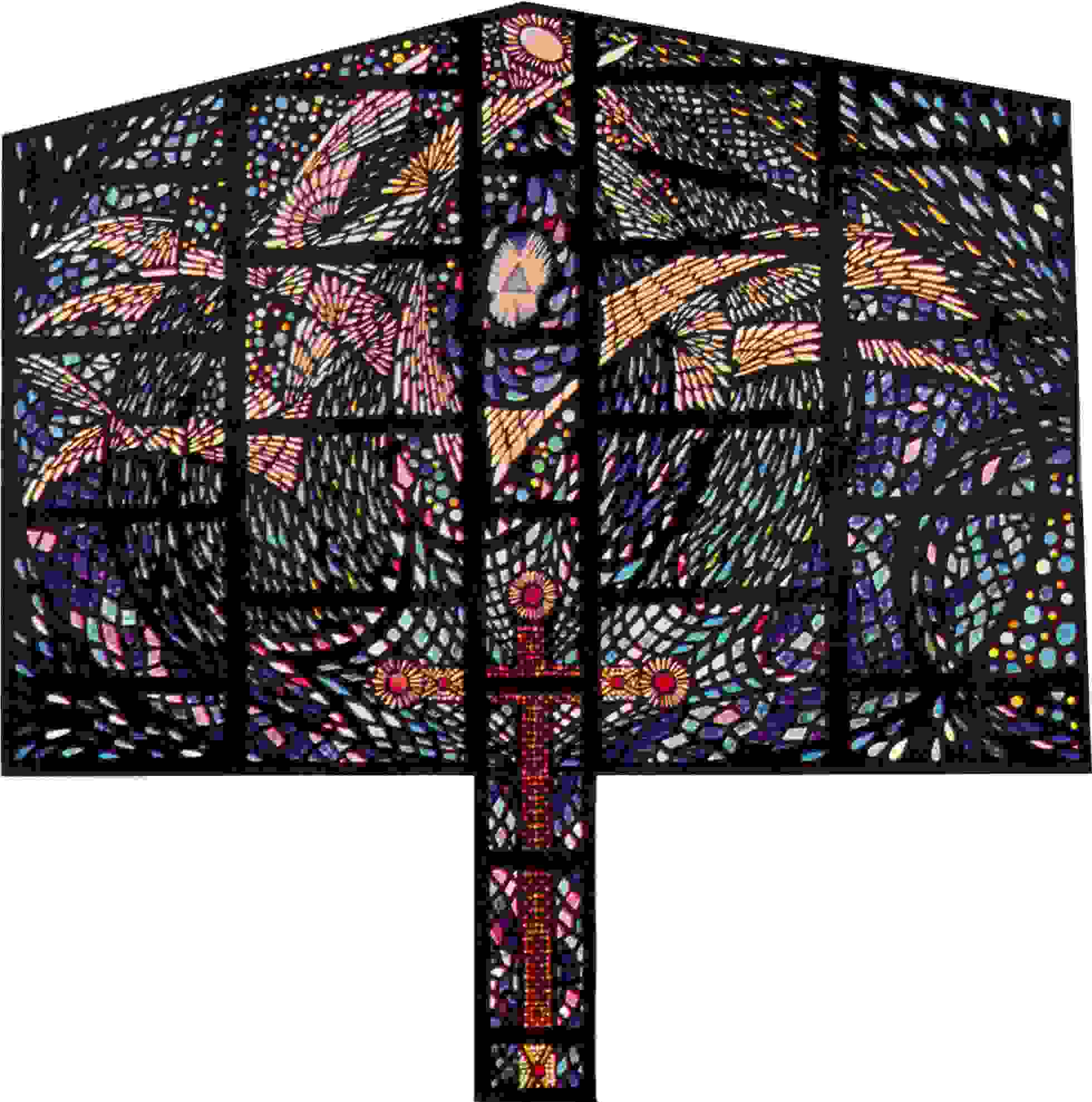 must necessarily be wholly inadequate. Christianity teaches that we are lifted by Grace to a participation in the Being of God and that we are destined for God's own happiness, the Beatification Vision of God. The window in its deep blue and purple colors portrays fulfillment, but the very center would indicate that this fulfillment is in the possession of the inner Life of God, the Most Holy Trinity. Perfection of all things is in Heaven. There are no sorrows, partings, sufferings nor tears. The Cross of Christ, symbol of His suffering, is glorified. The infinite God looks down upon the happiness of Heaven. His Love is now satisfied because even with His infinite power, He cannot give more than the direct possession of the beauty and love of His own Being. |