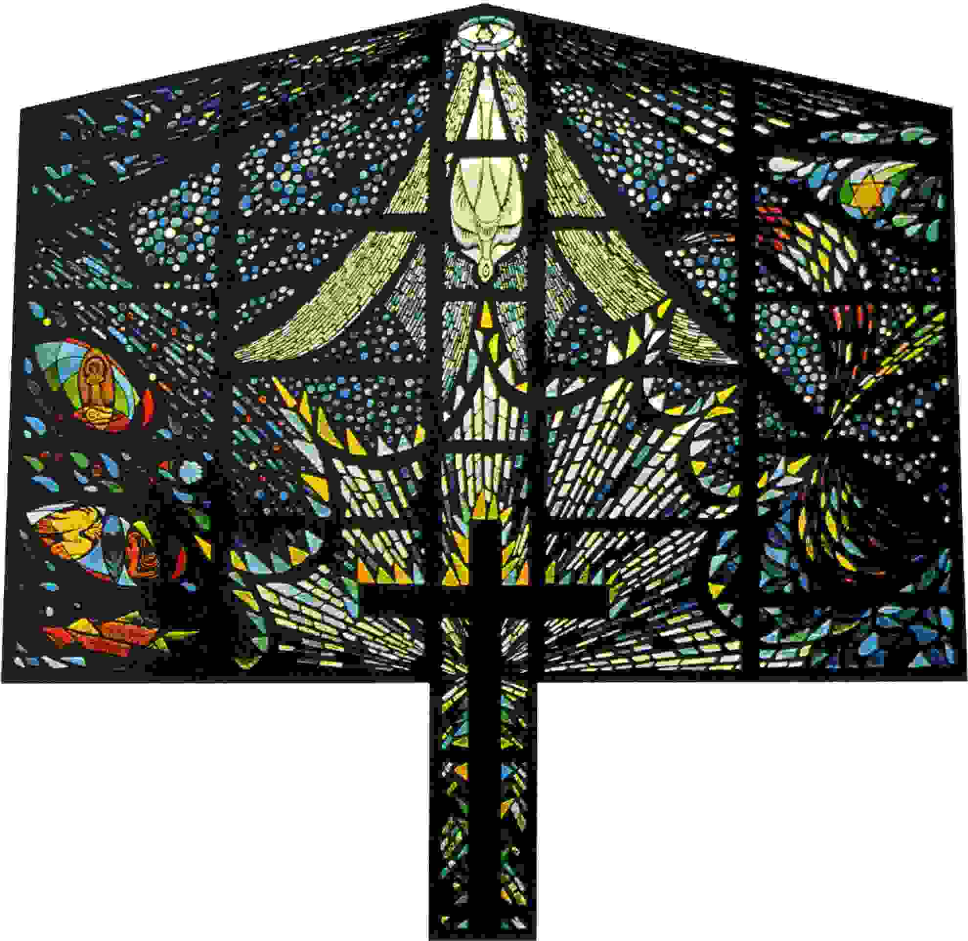 The Plates of the Commandments and Star of David tell us of the promise of reconstruction and the Annunciation. The Nativity Scenes remind us that to accomplish the restoration Love becomes Incarnate, assuming the powerfully attractive form of the God-Man, Christ. Nothing indicates the length of the period between the Fall and Redemption, which may have been thousands of years. The Redemption of the meriting of Grace is by Christ throughout His entire life. It reaches its pinnacle in Christ's tremendous love in giving Himself to death on the Cross. Grace radiates from the Cross to restore us to the Spirit of Love.