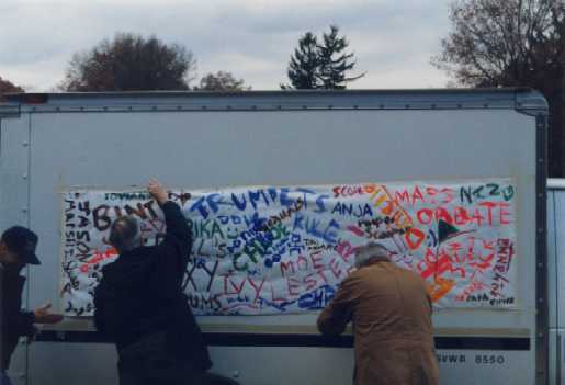 Sadly, this is a tradition which has died. What we used to do (at least what we did my freshman year) was that we all signed our names (and other stuff) to two long sheets of paper the afternoon of Giants Stadium. Then the roadies would do as you see here: they would tape them both firmly to the sides of the equipment truck. But, alas, we do this no more. : (
