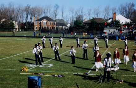 This is another picture from that WWII show. You can see in this photo that it must be the beginning of the piece "Swing, Swing, Swing" because the saxes are in their featured set and the guard is getting ready to dance. While the drill for us in this song was really easy...the music was really hard! We saxes are used to quarter notes and whole notes and perhaps some eighth notes from time to time. But never anything like this! It sounded horrible at band camp but by Giants Stadium we played it like pros!