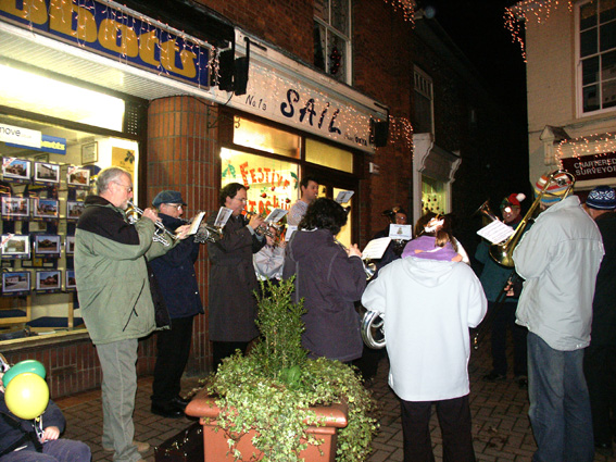 Stalham Brass band are regular performers at Holt Christmas Lights Switch On, raising money for the local Air Ambulance. Wednesday 24th November 2004. One of twelve Christmas functions the band attended.