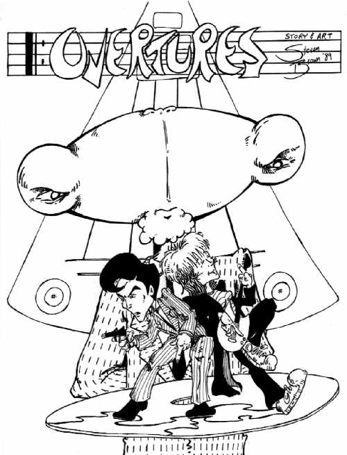 Notes: Ooo! A cover ... and now a title page. Well, at least this one turned out the way I pictured it in my head. I kind of like this one. Of course, it's still all shakey freehand ... that CD they're standing sure isn't ROUND. But still, the idea of the two characters standing back to back, the off balance feeling of standing on the disk, the menacing figure in the middle ground, and the shape that will have importance later on floating in the background ... I think this worked pretty well.