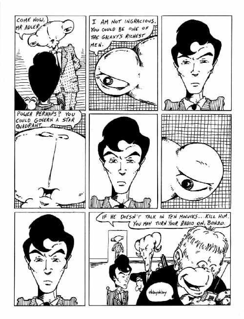 Notes: I'm actually very proud of this particular page. There's a lot going on, and none of it really draws attention to itself. As with movie special effects, the trick in creating an effect in the comics is to do so without having the audience NOTICE what you're doing. Here I use the multiple-frames-for-one-picture trick again to create the feeling of panning across Omnivore's face, but between frames I cut in a relatively static shot of Rob Adler (I think the page would have been improved if I'd had the technology to copy and paste the EXACT same image every time). Quick cuts. Back and forth. Like watching a tennis match. Each frame is the same size, except for the final one. I'd hoped that this would have created the feeling of a longer shot (both visually and chronologically) as we watch Omnivore leave the room. In order to have achieved that, though, I think I should have made his exit near the far right of the panel. Oh well, live and learn.