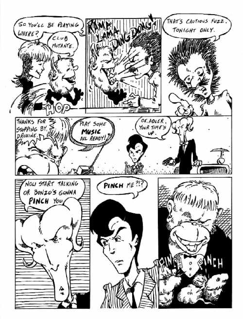 Notes: Rimshot is still one of my favorite characters. Not only is he an expressive little furball that's fun to draw, but he ONLY speaks in sound effects! It was a bit of a challenge to find things for him to say that actually ADDED to the scene (some of them are sort of "in jokes") ... but at the same time it was a lot of fun! I can't take credit for coming up with this idea. I first came across it (in the comics medium) in a giant talking potato Tom Stazer's wonderful independent comic Spaced.