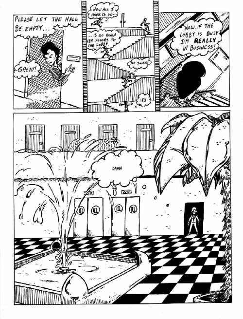 Panel #2: I'm rather proud of thinking of using the dead space between the panels to create a set of walls to give the stairway a more claustophobic feeling. Also, the use of drawing the same person multiple times in the same panel (to create the illusion of quick movement) is one that I don't use very often ... so I'm glad to see that it worked pretty well here.