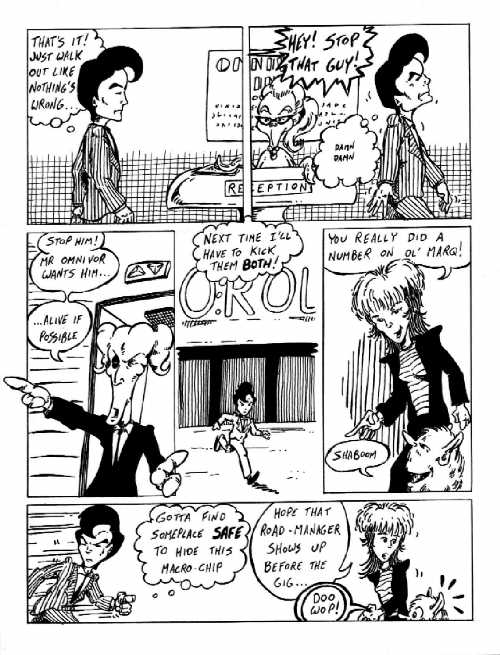 Notes: There's lots of strange stuff going on with the crosshatching on this page, and very little of it works the way I'd hoped. For the most part it's because the patterns draw attention to themselves. In panel #s 1 & 2 I wanted to create the feeling of there being depth without having to put real detail into the wall behind the receptionist-thing. But the pattern is too uneven and too close to the same weight in the stripes on Adler's suit. I have NO idea what I was thinking in panel #3 ... that weird, almost speed line style does the worst thing possible ... it stands out, but doesn't convey any sort of information. I AM happy with panel #4, where I decided to put crosshatching on the doors but NOT on Adler's suit. Panel #5 has an effect I like when it's pulled off well: a "spotlight" of tone. But here my "spot" is oblong and only shows on one side of the characters.
