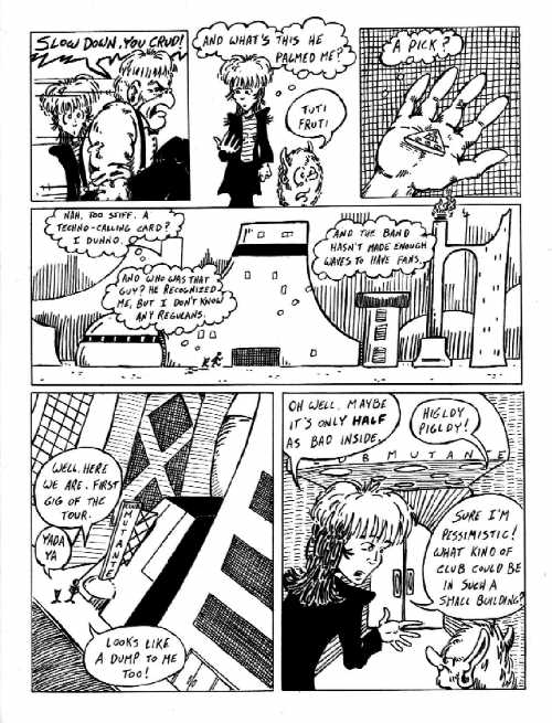 Notes: I'm still pretty happy with the way that city-scape looks. I have to tell you, I'm not really big on architectural drawing, but I wanted to do something to re-establish the fact that this was an alien setting. With comics being what they are, just having weird-looking characters is not enough ... there are too many really great cartoonists telling stories of monstrous (or just bizarre) characters in normal settings. It's important to create a world for the characters to live in ... and that's really not my forte.