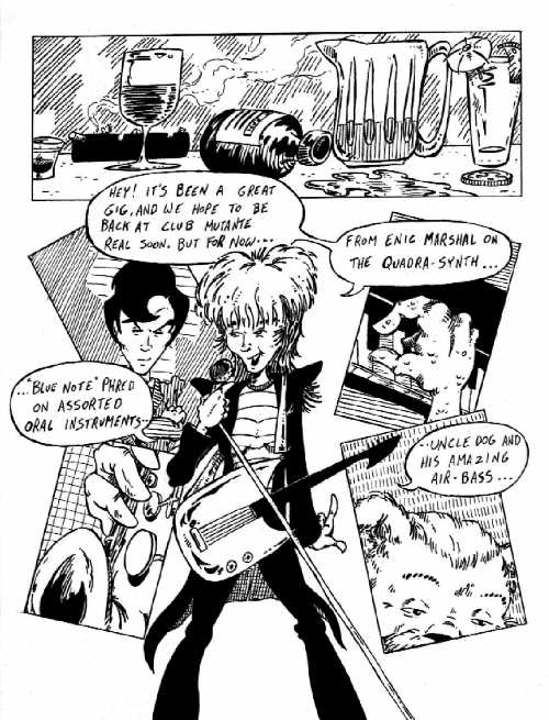 Notes: I remember being fascinated in one art class by an assignment that asked us to use purely visual cues to show the passage of time. What do I mean by that? Well, panel #1 above is a perfect example. The previous page began with the band just starting its first set. Now we see a bar with full ashtrays, empty drinks, and spills everywhere. Theoretically this conveys the notion that we've reached the end of the night (or at least progressed several heavy-drinking hours into it) ... the reader immediately knows that time has passed without an intrusive "A few hours later ..." narrative box.
