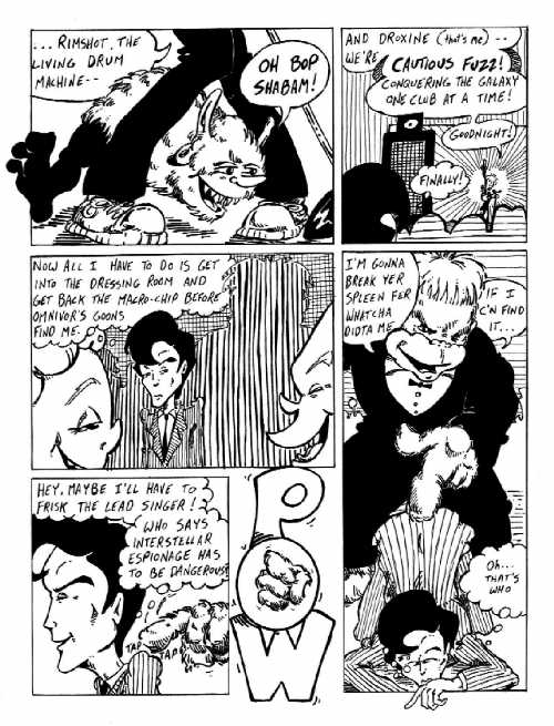 This page has a lot of instances where different styles of crosshatching are meant to represent different levels of depth in the image. For example, in panel #2 the crowd is done with horizontal lines while the stage is done with vertical ones ... the hope is that your eye recognizes them as different "layers" and automatically creates a feeling that one is in front of the other. This is all well and good in theory, however my lack of patience once again undercut the effectiveness of my plan. This is ESPECIALLY true in panel #3.