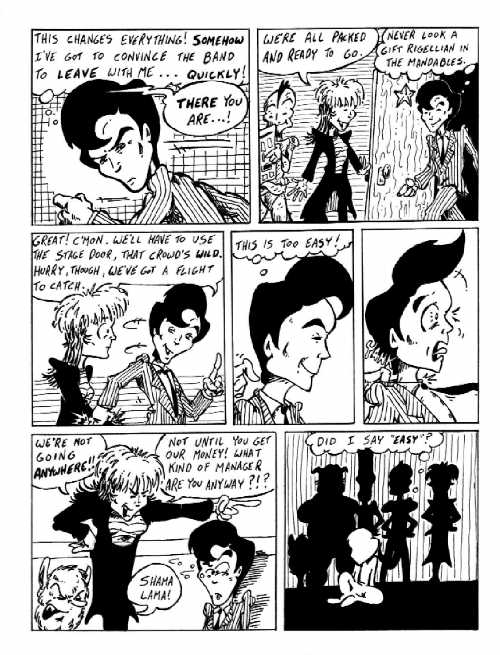 Notes: Looking at this page, I just run hot and cold. I REALLY like panel #1 ... both Adler and the background (including the spotlight) work just the way I pictured it in my head. But what's up with the lava-textured door in panel #2? (And who stuck the starfish on the door ... that's just MEAN!) The whole page is like that for me ... one image just the way I wanted it, the next seeming rushed and sloppy. I WISH I'd been able to get a better bug-eyed look out of Adler in panel #5. And while I like the layered feeling in the final panel, none of the silhouetted figures seem to have the correct posture. Or maybe it's that the floor is uneven (look at the horizon line). I mean, Phred should be MUCH taller than Uncle Dog and Enich, and Droxine should be half-a-head shorter.