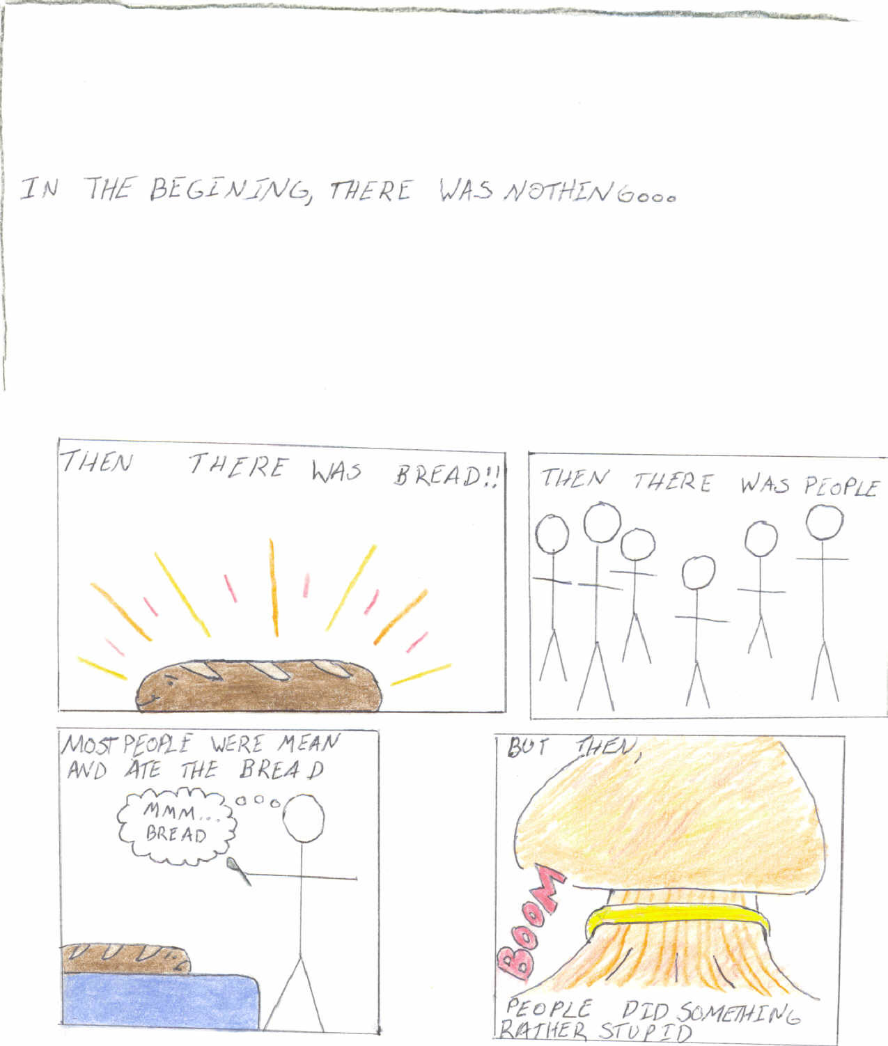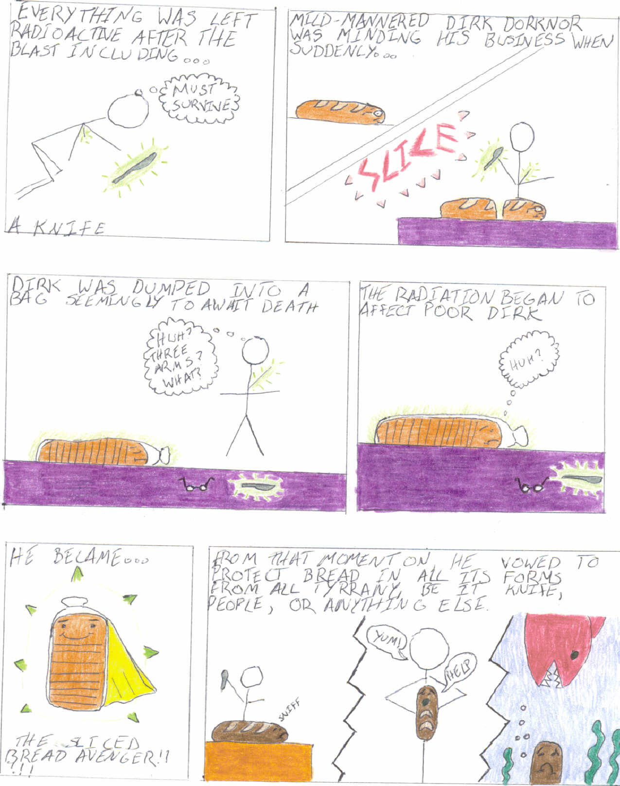 yes, everyone, here it is. here is what happens when i am bored, tired and hungry all at the same time in chemistry clss. the chronicles of the sliced bread avenger. i've decided to redo all of his adventures, because the drawings in my chem notebook are kinda smeared and at least one page is dissolved and another ruined, because i spilled hcl on them. not smart.
