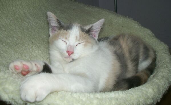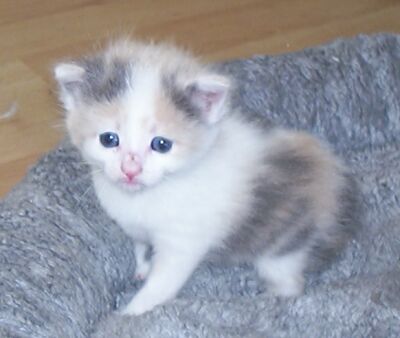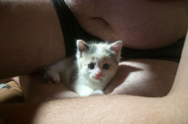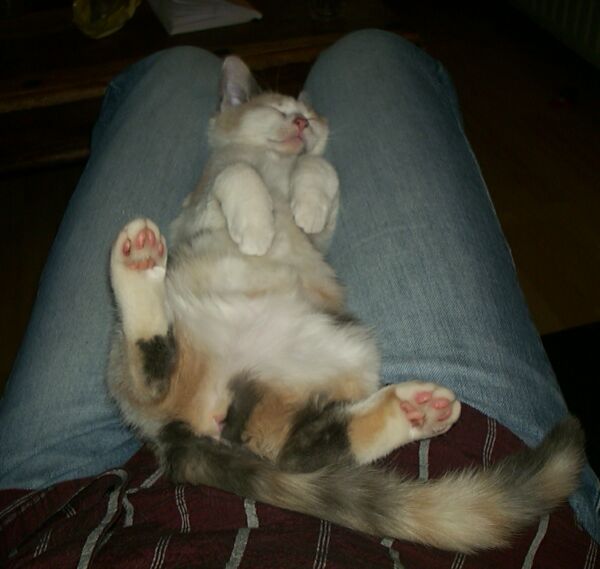 Onze Moon is gevonden toen ze 3 weken oud was, in de berm van een drukke polderweg. Ze zat daar hartverscheurend te mauwen en een lieve mevrouw heeft haar meegenomen in haar fietstas. Maar ja wat moet je met een babypoes die nog moedermelk nodig heeft? Juist, die geef je aan Naat en die kweekt het ding wel op. Om het vervolgens natuurlijk nooit meer te laten gaan :-)