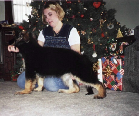 "Annie" A heavy boned cobby female with absolutely stunning pigment and a very plush coat. Beautiful short mid-section, solid strong short back, ribbing appears long and well sprung. Beautiful sweeping rear assembly and the long croup, a correctly placed tail complete the picture. A beautiful youngster, showing much promise and with bone like this, a future mother of awesome males!!!
