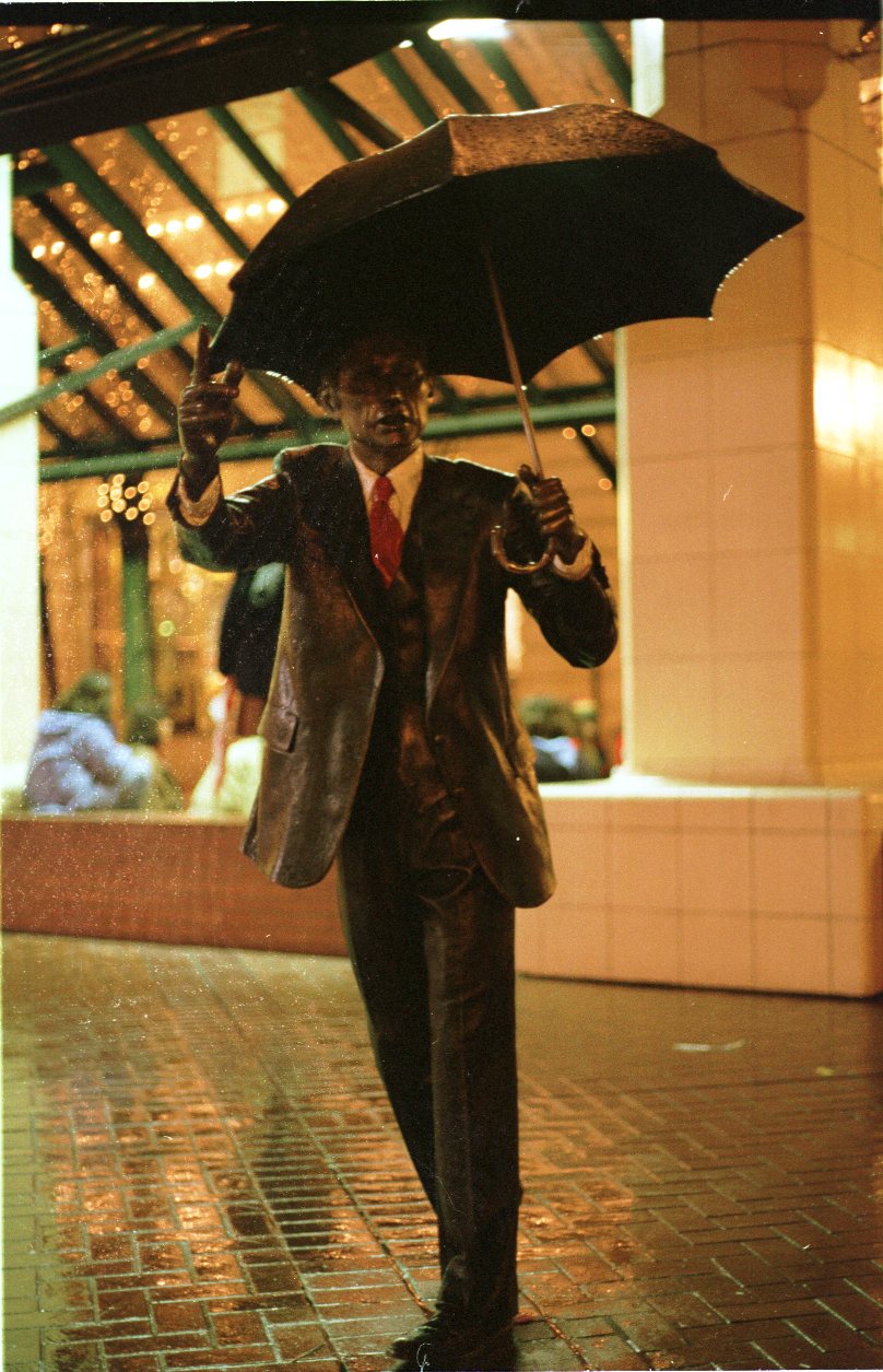 a statue at night while raining