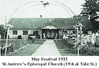 On a Sunday afternoon in February 1911 St. Andrew's was organized as a congregation of the Episcopal Church in the parlor of Mrs. Henry J. Brown's home at 212 West 19th Street. The Rev. Mr. Benjamin Andrew Rogers was honored in the choice of his middle name for the new congregation. When the worshippers grew too numerous to gather in the Brown's home, Mr. Fred Dexter offered the use of his hall (which the Oddfellows were also using). |