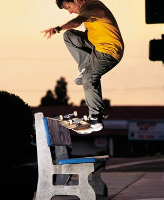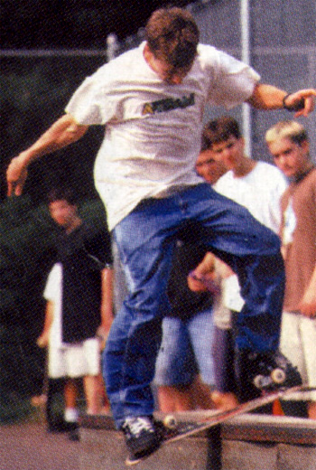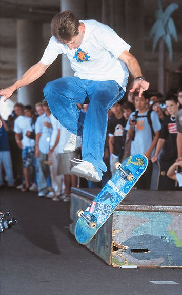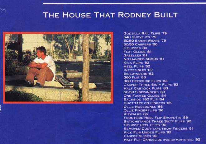 | In all of his life of competeing in skate competitions, he has only lost once! His Dad made him quit for four months befor letting him start up again. His nick names are: the Mutt and The King Born in Gainesville FL Started skating 1/1/77 turned pro 8/21/80! He is now currently sponcered by Enjoi Boards, Tensor trucks, Darkstar Wheel, Speed demon Bearings, Globe shoes and Matix clothing. He owns Tensor trucks and used to own A-team. VIDEO PARTS: 1980something: Video show (in it he is 12 years old and doing EXTREMELY technical freestyle tricks!) by Powell and Peralta. 1987:The search for Animal Chin (freestyle in a party)by Powell and Peralta 1987:Public Domain (triple kickflip on flat ground))by Powell and Peralta 1989:Rubish Heap(freestyle stuff) by World Industries 1992:The Questionable Video(nollie 360 shovit late flip, 540 double flip) by Plan B 1994:Virtual Reality(triple heelflip, bs flip underflip)by Plan B 1995:Second Hand Smoke(bs 180 to Casperslide) by Plan B 1997:Rodney Mullen vs Daewon Song(casper down picnic table, freestyle) by World Industries and A-Team 1998:Canvas(360 flip to nose manual down a hill) by Globe 1999:Rodney vs Daewon round 2(fs darkslide, kickflip nose manual 360 flip out down picnic table)by World Industries and A-Team. He is also in two 411 videos, they are issue # 23 and 31, there is a "profile" and a "day in the life!" |
