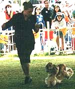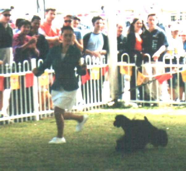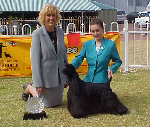 | National Runner Up Joanne Stewart with her chosen dog the American Cocker and the judge Mrs G Morison (Sth Africa) |
