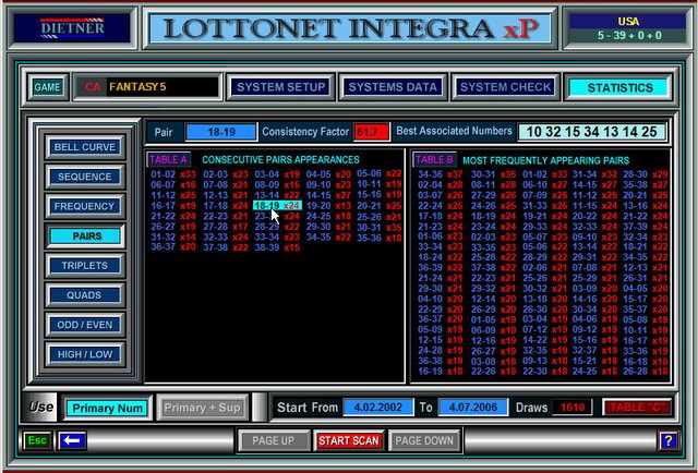 The PAIRS scanner computes all winning results and displays how many times the numbers have appeard together as pairs (separated as "Consecutive Pairs and Most Frequent Pairs). In addition, by hovering with mouse pointer over any Pair, the Program will automatically indicate 6 Best Associated Numbers with that Pair.