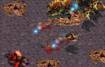 Attacking: The primary goal of your drop will be to take out the tech tree. Hydralisk Dens and Spires should be the first buildings to destroy, but do not sacrifice your Reavers. Make sure that they attack any ground resistance, which they should be able to do with ease. Imagine yourself taking a rocket launcher and unleashing it on some unsuspecting bugs in your basement. No, don't. Really, for your own sake.