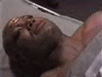 "This is horrible! Laid out under observation like some sort of freak, having metal probes stuck in places I never even knew I had, this stupid little worm being pulled in and pushed out of my stomach. Oh well...it could be worse. I could be naked and....oh....dang it....never mind...