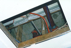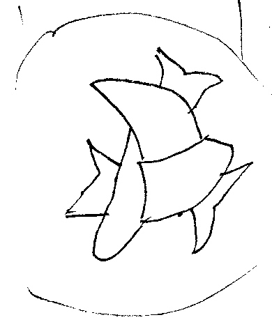 | The above is a hole cut in the ceiling on the lower level of Old Parliament House. It is covered with perspex and somewhere up there on a concrete column is the rough sketch of three intertwined fish (see my drawing on right). Nothing much is visible at this stage but hopefully the authorities will install a spotlight to illuminate the drawing. | ||