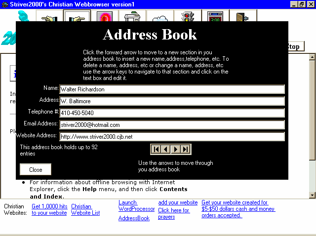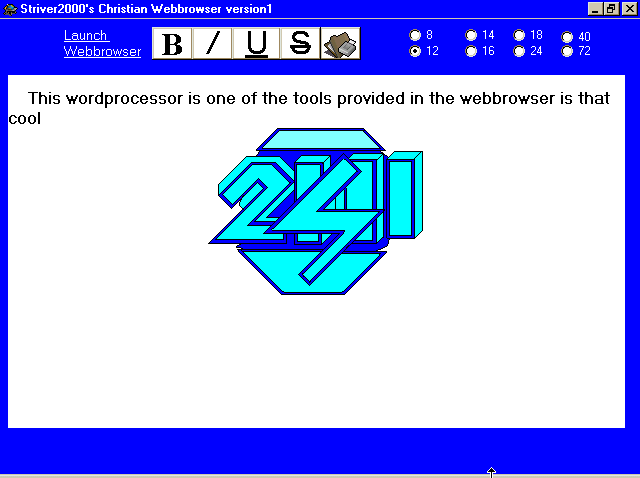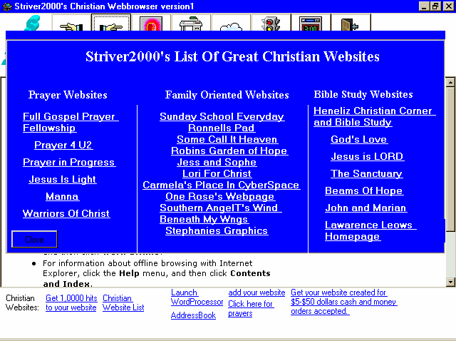 Striver2000's Christian Webbrowser is one of the best christian webbrowser's if not the only on the internet. This christian webbrowser has a webbrowser,prayers,a list of great christian websites,an addressbook, and much more. You can download the webbrowser now