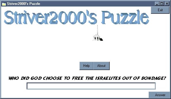 Striver2000's Puzzle is a interesting puzzle that you have to solve by answering christian questions. Download this program and tell me what you think today! :)