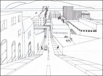 drawing. It's not any particular place, just a city with steep hills and a big river.
