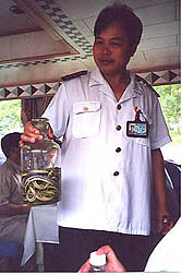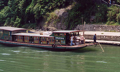 During our lunch, which was prepared for us as a box lunch from the Sheraton Hotel, thank goodness, one of the stewards came around to offer us a delicacy. Snake wine!! Can you see them in the bottom of the jar he is holding? I had heard from people who had been on this cruise before that the food and the squat toilets found on the ship were to be avoided if possible. Thanks to the Sheraton, and our delicious box lunch we were able to avoid the food and wine, and by judiciously watching what we drank we didn't have to use the squat toilet. |
