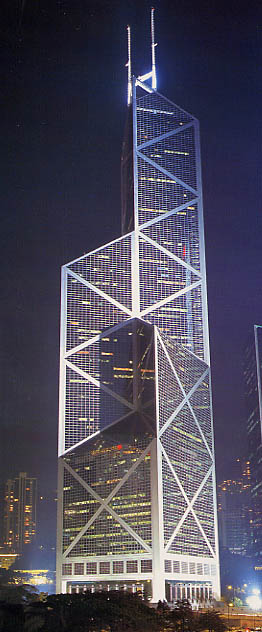 | This is my favorite building in China, and we could see it from our balcony. Obviously I didn't take this photo. It was on a piece of advertising. It is the Bank of China. They commissioned architect I.M. Pei. to design this stunning building. His father had been the bank's first Hong Kong manager of the Nationalist era. Pei's 70 story structure is wonderful looking with it's interlocking triangles. Pei said that he had been inspired by a bamboo sapling, seen by Chinese as a symbol of strength and endurance. |