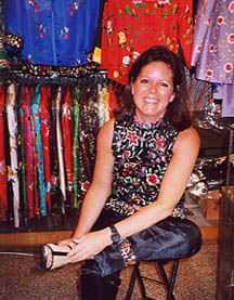 Sue trying on a new outfit that she ultimately bought. The top is completely embroidered with the pants having the embroidery just around the cuffs. She had brought along fancy high heel shoes to try on some outfits which came in very handy at tea time. |