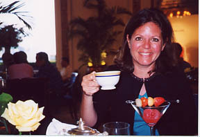 Here is Sue at afternoon tea at the Peninsula Hotel. They started to turn her away because she was wearing walking sandals, but she said she would change her shoes in the ladies room, and be right back. And sure she was right back wearing her high heel sandals. She was seated. It was a lovely tea with finger sandwiches, scones, little desserts, and watermelon plus fruit in a lovley glass. |