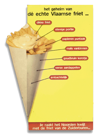 Voila un cornet de frites avec la mayonnaise. Commes c'est bon la mayonnaise et les frites! Qui a besoin de Ketchup? Pas moi. En plus vous pouvez apprendre un peu de néerlandais - cela vous faites du bien. N'oubliez pas que la Belgique est bilingue.