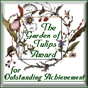 THE GARDEN OF TULIPS AWARD: (Received on 1st June 1999) Laura wrote to me:" I took some time and carefully checked out your site. I'm pleased to offer my humble little award to you". Thank you so much Laura for this lovely gesture and encouraging words. I feel honored for winning your award. |